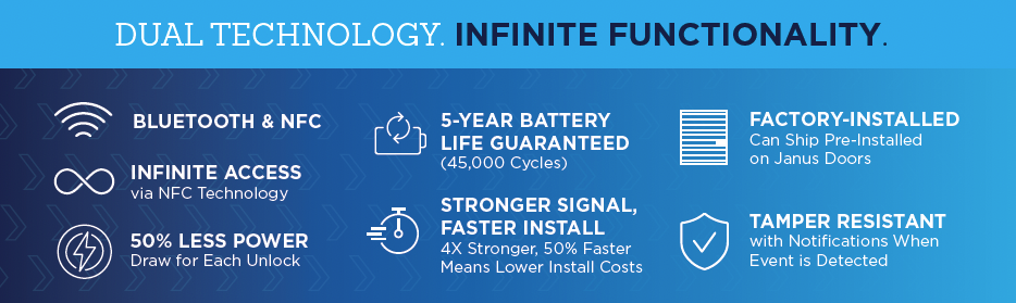 Nokē Infinitē™Nokē Infinitě is an on-door, dual-technology smart locking system that is the latest addition to the award-winning line of Nokē Smart Entry products. Nokē Infinitē combines the robust features of Bluetooth with the power-harvesting capabilities of NFC, making it the first and only battery-powered self-storage smart lock that can be accessed even after 5-year / up to 45,000-cycle battery life. Infinitē was designed for retrofits and has 4x stronger signal strength and 50% faster to install than previous Nokē battery powered smart locks, and is backed by an industry leading 5-year battery warranty.