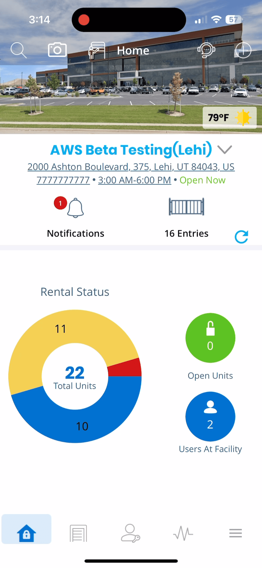After selecting the 'Entries' section, the app will display a list of entry points at your facility that you have access to.