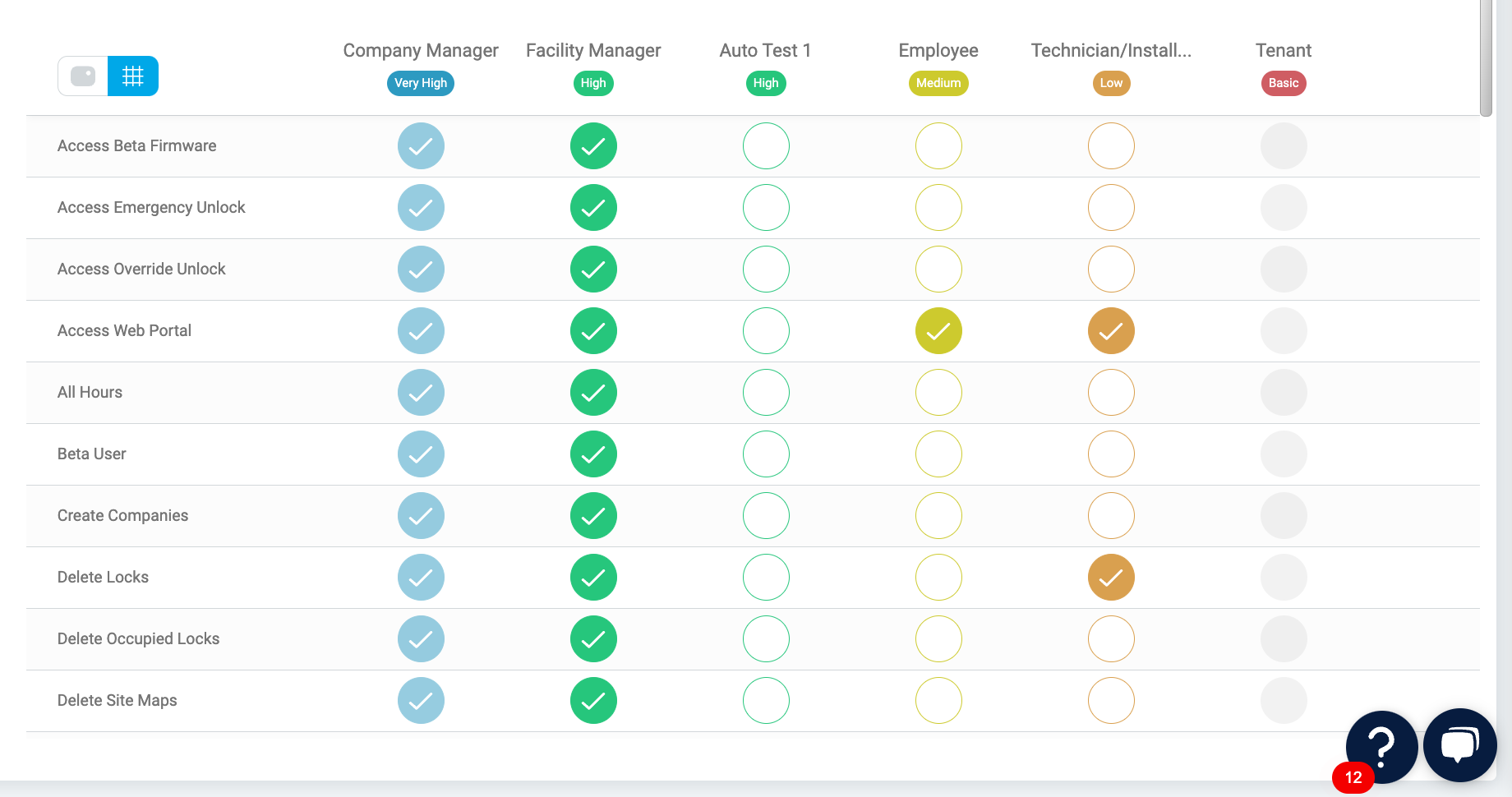 - A filled-in check mark indicates the role has that permission.