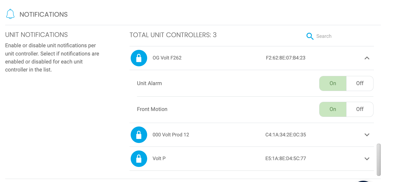 If facility-level notifications are enabled, each user can also enable or disable notifications for individual unit controllers. These notifications are related to 'Motion Events' happening at a unit or the 'Unit Alarm' being triggered. These notifications are specific to events that are related to specific units (and turned on and off at the unit level).